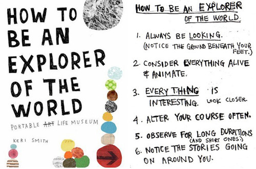 Then another someone, Kerri Smith (I can pull her name right out of the ol’ memory bank because I own one of her books: Wreck This Journal), wrote a whole book about this habit. She calls her book How to be an Explorer of the World: A Portable Life Museum. She offers a list of ways to respond with awe and wonder: